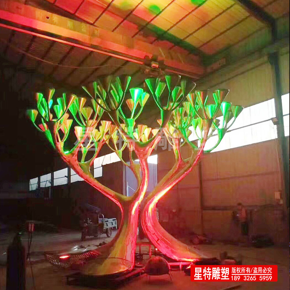 “彩色不銹鋼雕塑所使用的材質(zhì)它是在銀白色的不銹鋼表面形成一層透明的氧化膜,通過該氧化膜對光的干涉作用而形成不同的色彩。也可以通過噴漆的形式來展現(xiàn)雕塑的色彩。