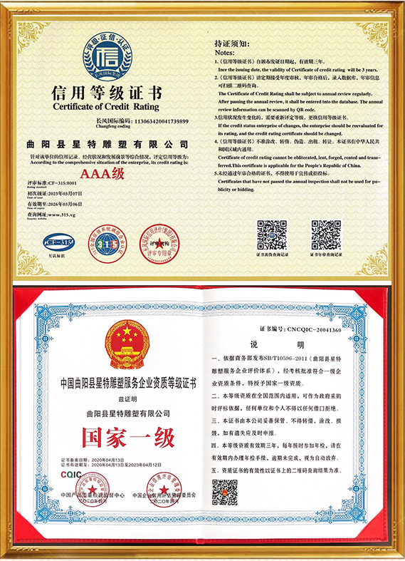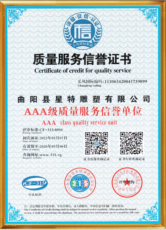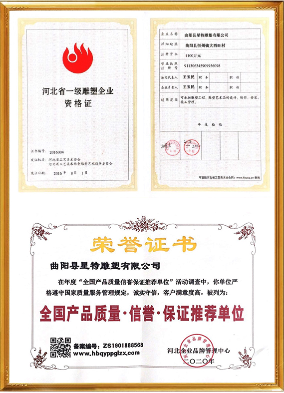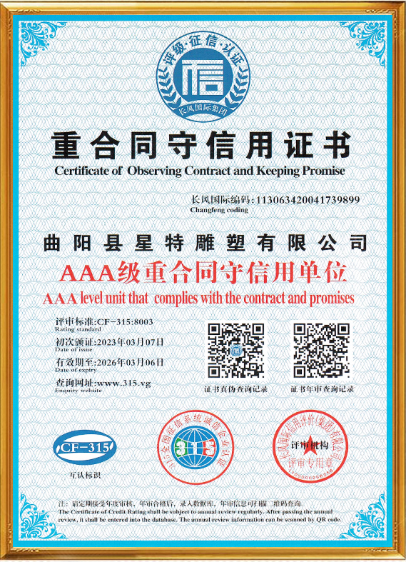 曲陽縣星特雕塑有限公司成立于2008年,總部位于具有千年雕刻文脈、擁有“中國雕刻之鄉(xiāng)”美譽的河北省曲陽縣,是一家集創(chuàng)意設計、雕塑生產(chǎn)、雕塑藝術(shù)創(chuàng)作、景觀環(huán)境藝術(shù)為一體的雕塑公司。在十幾年的時間里,我們從蹣跚起步,再到砥礪前行,始終持初心、踐匠行,為弘揚曲陽雕塑文化做出自己應做的貢獻。目前,我公司與中央美術(shù)學院、清華大學美術(shù)學院、西安美術(shù)學院等全國知名美院機構(gòu)保持長期的交流與學習,并與多個國家雕塑、美學專家老師合作、溝通、共享雕塑帶來的無國界藝術(shù)享受。成功設計并制作了數(shù)百個城市雕塑作品,受到了當?shù)卣⒅鞴茴I(lǐng)導及客戶的表彰和贊譽。公司已通過(ISO9001)國家質(zhì)量體系認證,將繼續(xù)秉承誠信、自律、求智、進取的企業(yè)精神,和崇尚榮譽、捍衛(wèi)責任、創(chuàng)造價值的企業(yè)核心價值觀,弘揚中華藝術(shù),振興民族產(chǎn)業(yè),發(fā)展星特企業(yè),用事實說話,用作品見證,力爭打造一個生命力強勁的民族雕塑企業(yè)向著國際化現(xiàn)代企業(yè)集團邁進,為曲陽雕塑文化的發(fā)揚做出重要貢獻。